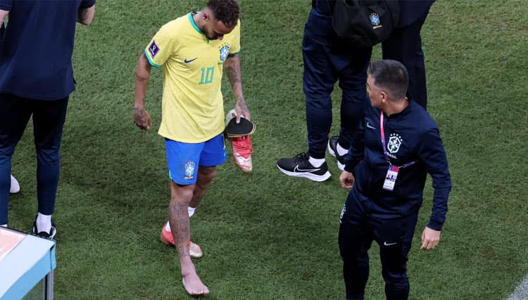 Neymar terlihat pincang setelah pertandingan, sementara foto sang striker menunjukkan pembengkakan pada pergelangan kaki kanannya.